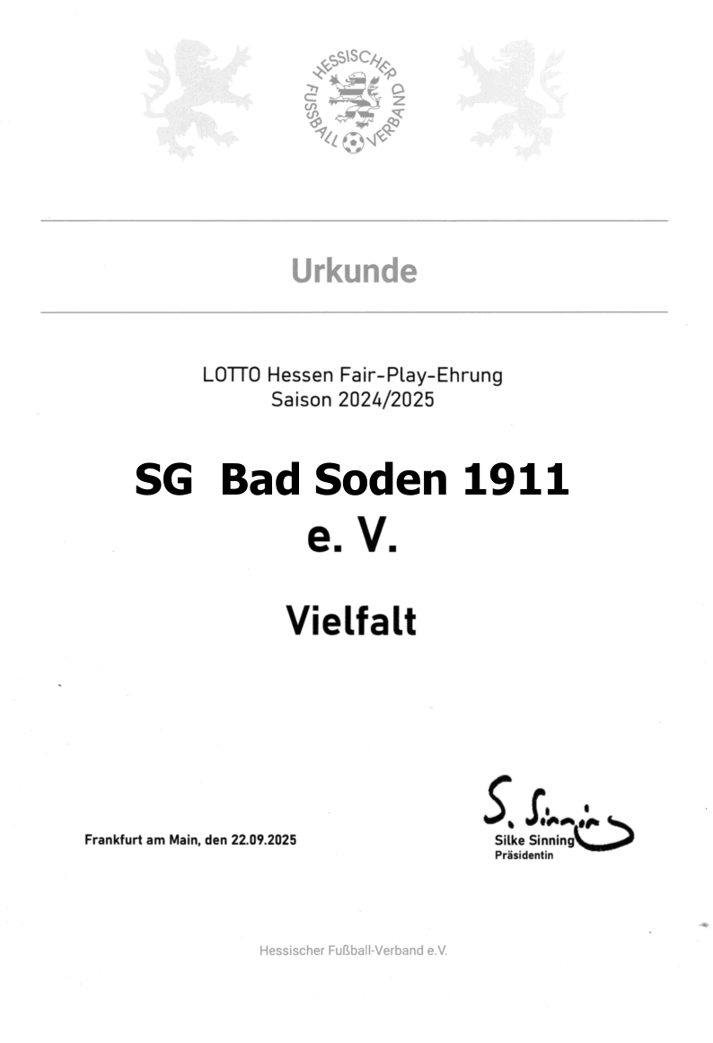 Große Ehre für die SG Bad Soden: Im Rahmen der jährlichen Fair-Play-Ehrungen des Hessischen Fußball-Verbands (HFV) wurde unser Verein in der Kategorie Vielfalt ausgezeichnet. Gemeinsam mit Förderer LOTTO Hessen würdigt der HFV damit Menschen, Vereine und Institutionen, die sich durch besonderes Fairplay, respektvolles Miteinander und soziales Engagement im Fußball hervorgetan haben.