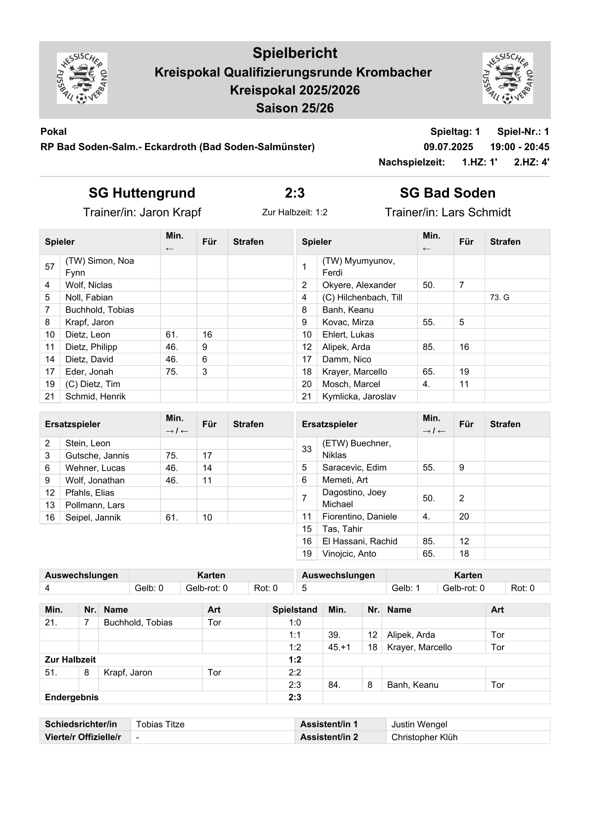 | Spiel 3 | 09.07.2025, 19:00 Uhr | SG Huttengrund | - | SG Bad Soden | 2:3 |