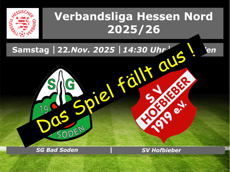 (22.November 2025) Die für heute angesetzte Verbandsliga-Partie zwischen der SG Bad Soden und dem SV Hofbieber fällt aus. Sowohl der Rasenplatz als auch der Kunstrasen sind vereist und lassen eine sichere Austragung des Spiels nicht zu. Ein neuer Termin steht bislang noch nicht fest.